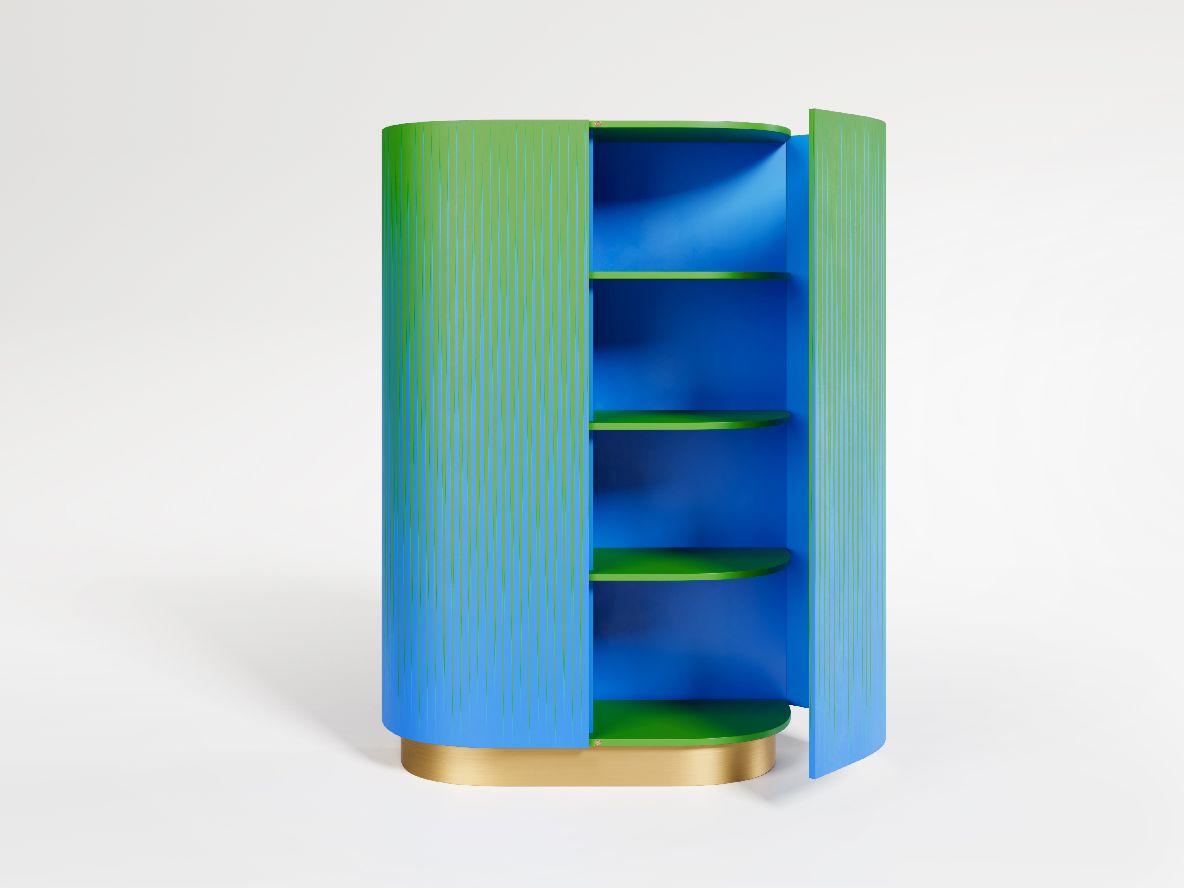 Conceived as a special object where to store precious things, the cabinet rest on a brass base and it makes use of colors also inside, with an intense blue interior and green shelves.